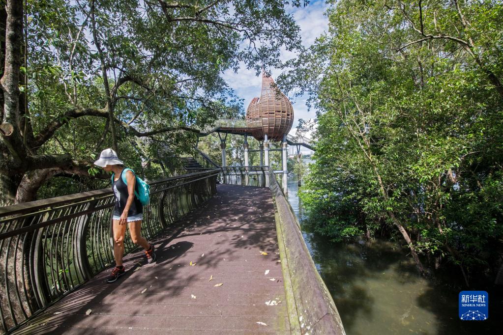 10月27日,在新加坡雙溪布洛濕地保護區,參觀(guān)者走在紅樹(shù)林間的木棧道上。