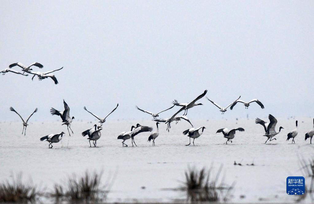 11月4日拍攝的在貴州草海棲息的國家一級保護動(dòng)物黑頸鶴。