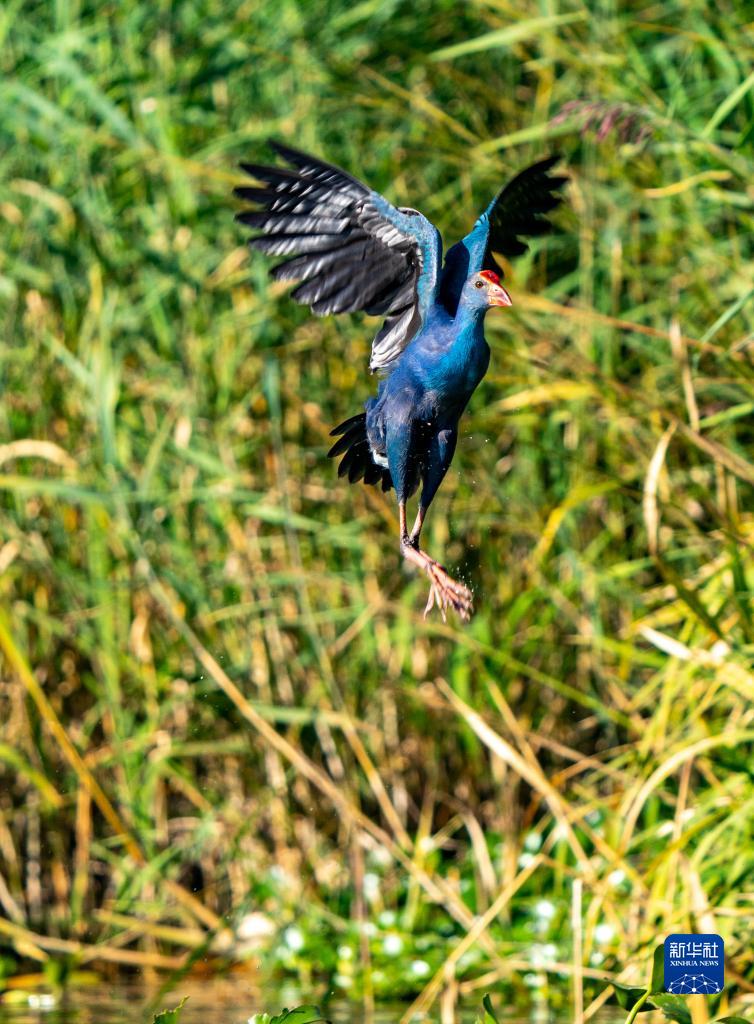 在濕地蘆葦間跳躍的紫水雞(10月28日攝)。