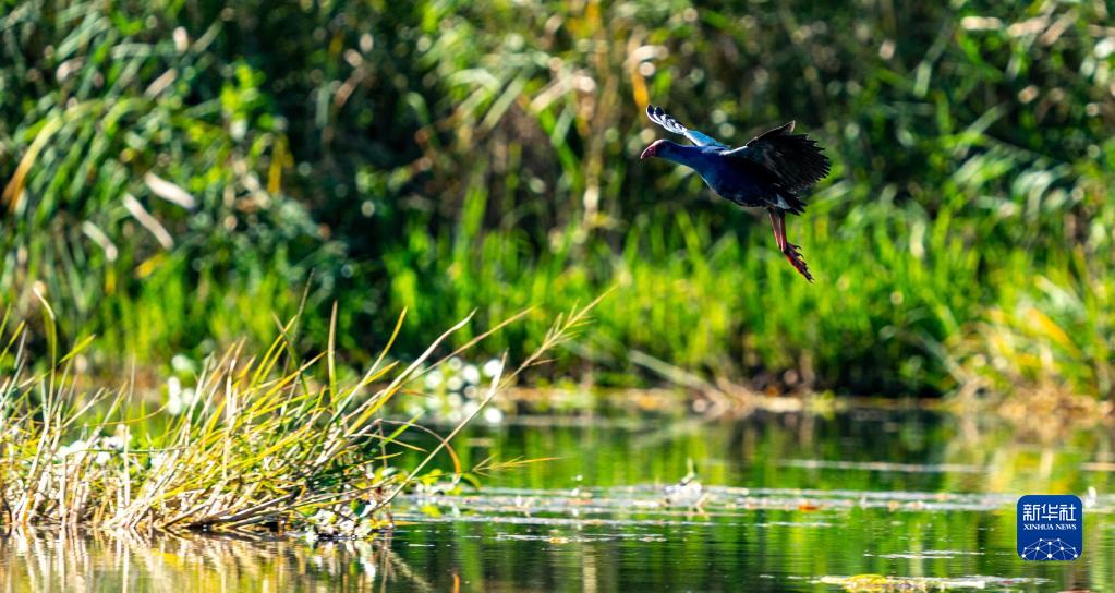 紫水雞在濕地蘆葦間跳躍(10月28日攝)。