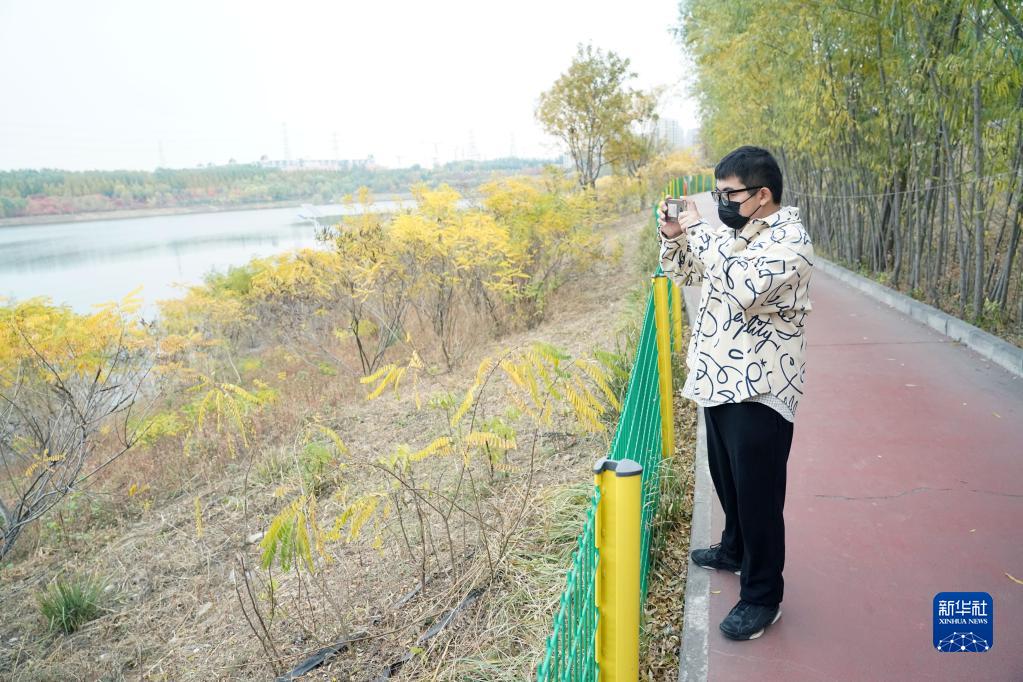 北京科技大學(xué)應屆畢業(yè)生石全在所居住的青年公寓附近的公園內拍攝秋景(10月23日攝)。