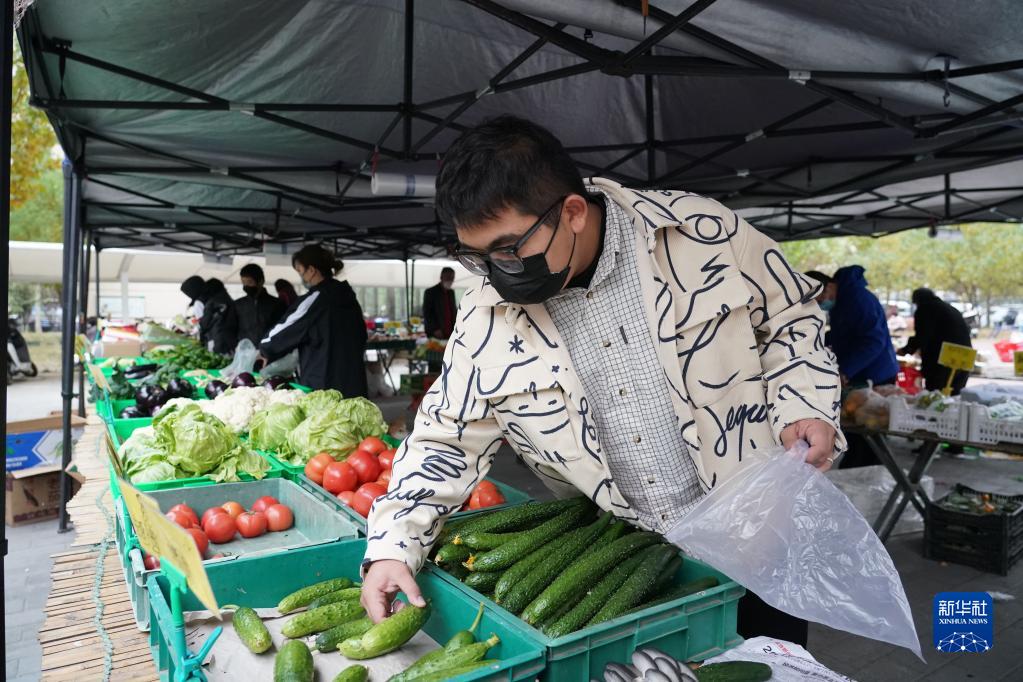 在金隅·山樾嘉園小區,北京科技大學(xué)應屆畢業(yè)生石全在小區內的便民菜站選購蔬菜(10月23日攝)。