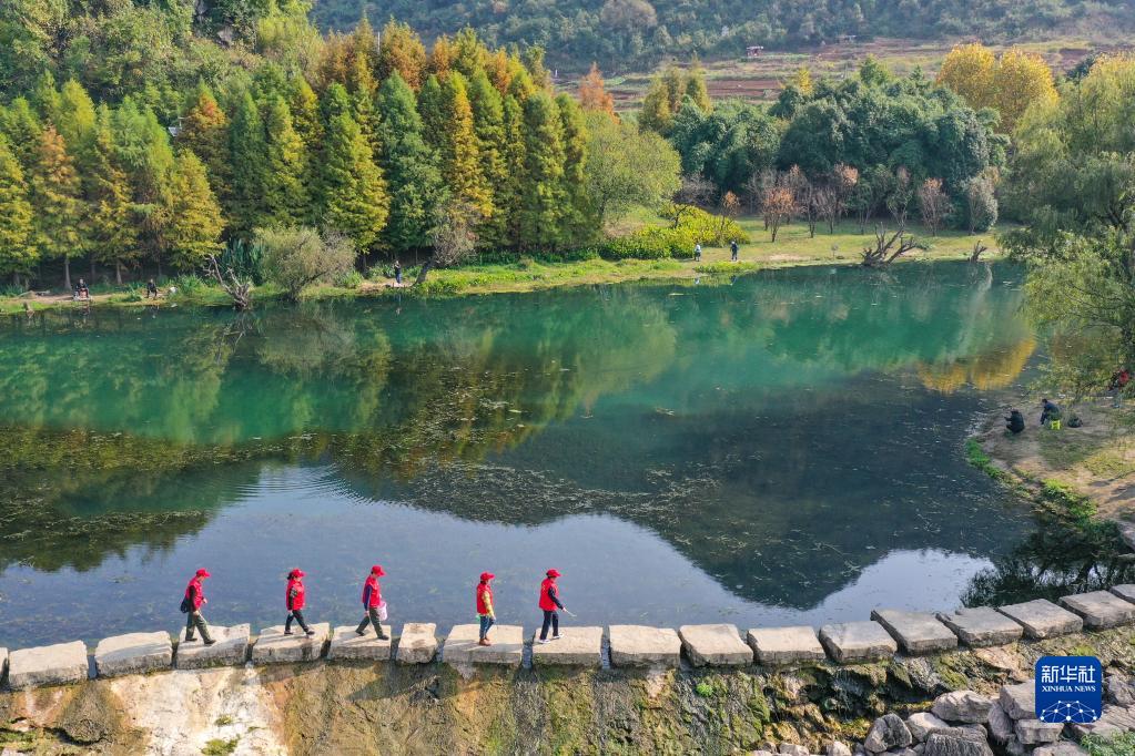 11月4日,在貴州貴陽(yáng),周余慶(右一)與志愿者一起在花溪國家城市濕地公園內巡河(無(wú)人機照片)。