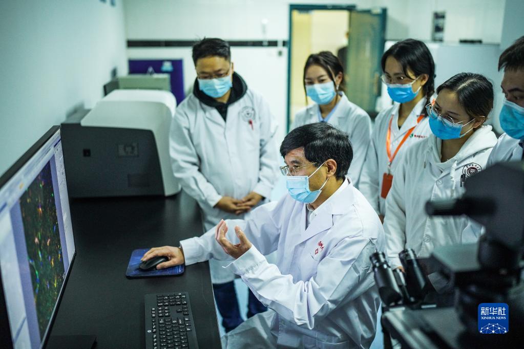 梁貴友(中)在貴州醫科大學(xué)分子生物學(xué)重點(diǎn)實(shí)驗室與師生交流(11月2日攝)。