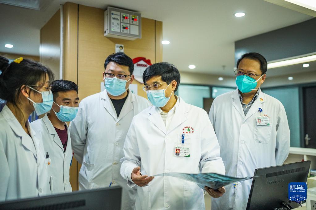 梁貴友(右二)在貴州醫科大學(xué)附屬醫院心臟外科與規培、實(shí)習學(xué)生(左二、左一)進(jìn)行交流(11月2日攝)。