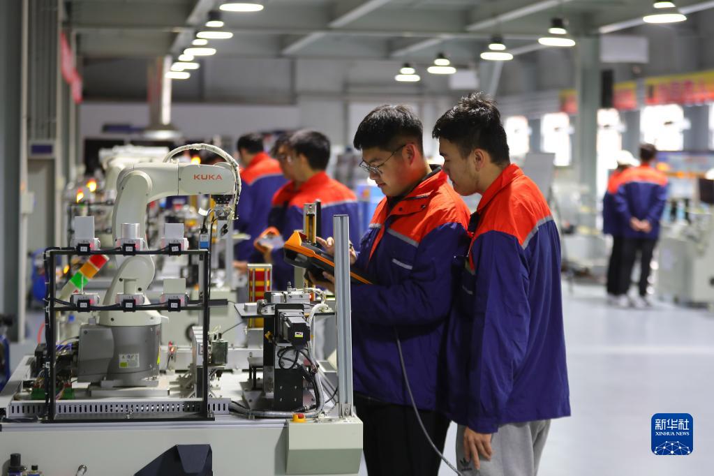 11月2日,在沈陽(yáng)工學(xué)院工業(yè)機器人實(shí)訓中心,機器人工程專(zhuān)業(yè)學(xué)生進(jìn)行工業(yè)機器人基礎實(shí)踐應用操作。