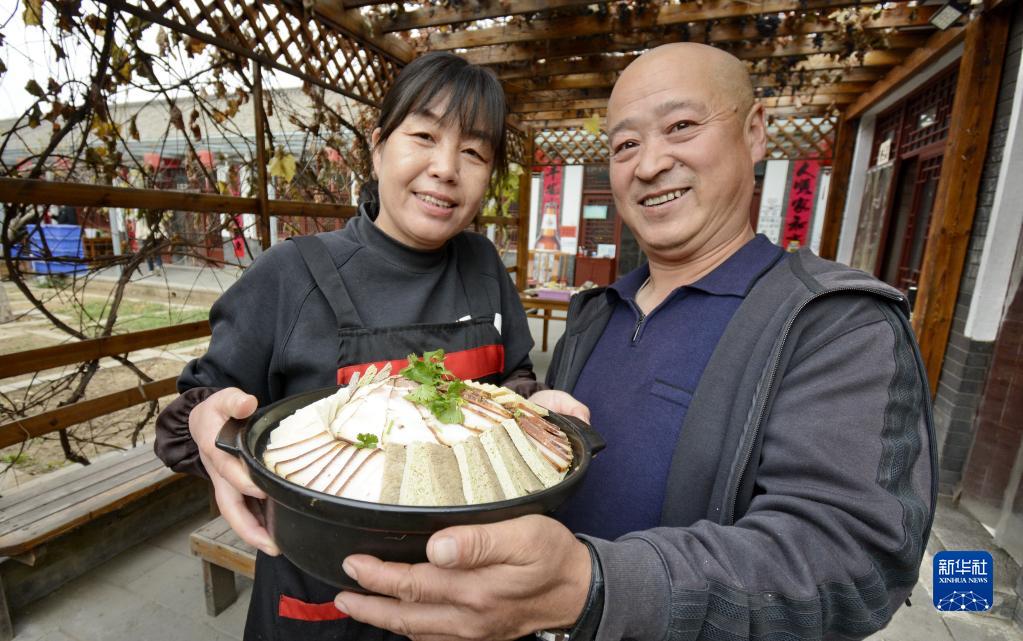 柳溝村第一批從事農家餐飲的豆香閣農家院的農民張淑琴(左)和胡寶國夫婦展示為游客制作山村豆腐宴的菜品(11月2日攝)。