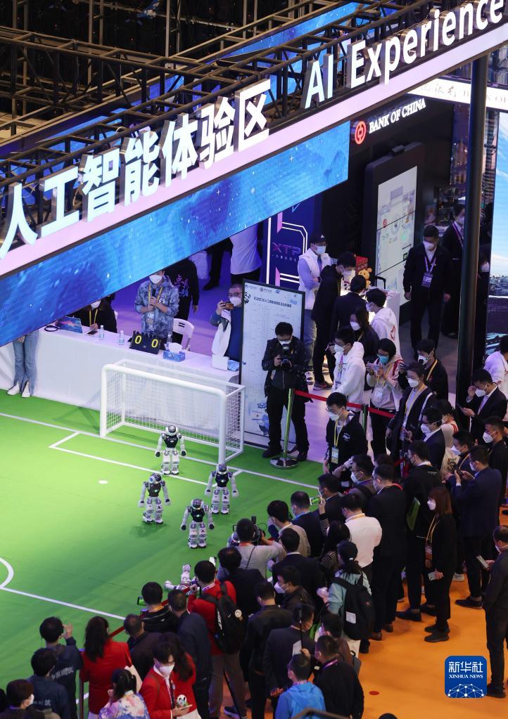 11月5日,參觀(guān)者在第五屆進(jìn)博會(huì )人工智能專(zhuān)區觀(guān)看機器人表演。