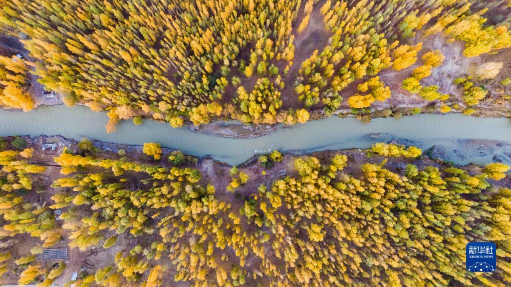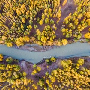 新疆博樂(lè )博爾塔拉河國家濕地公園秋景(2022年10月20日攝,無(wú)人機照片)。