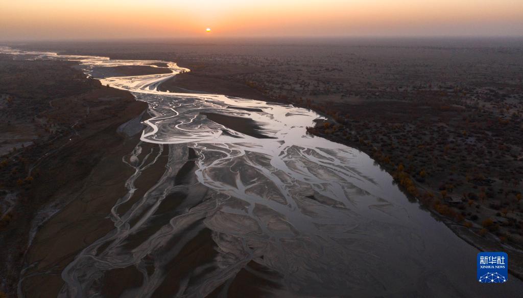 這是在塔克拉瑪干沙漠腹地拍攝的新疆于田克里雅河國家濕地公園(2019年11月10日攝,無(wú)人機照片)。