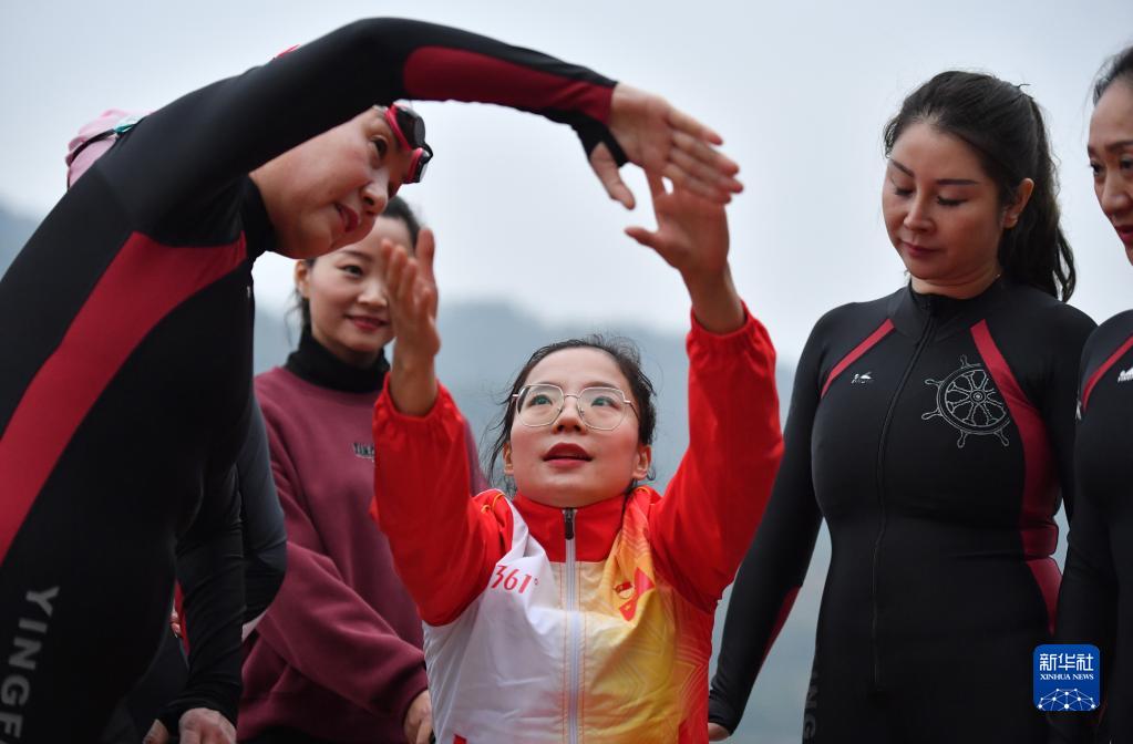 11月3日,在石泉縣游泳愛(ài)好者經(jīng)常聚集活動(dòng)的漢江岸邊,夏江波(中)指導愛(ài)好者劃水動(dòng)作。