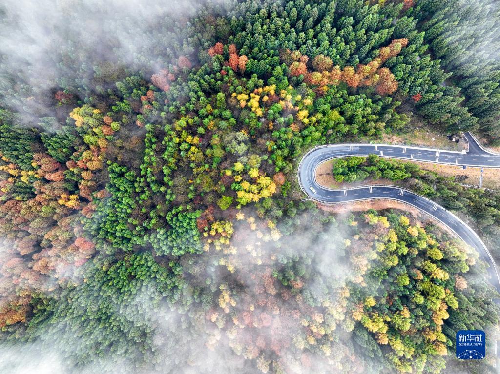 這是10月31日在湖北省恩施土家族苗族自治州建始縣業(yè)州鎮拍攝的秋景(無(wú)人機照片)。 新華社發(fā)(張遠明 攝)