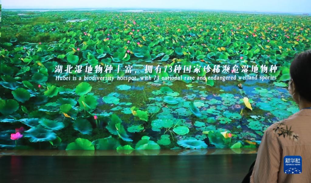 11月5日,參觀(guān)者在武漢東湖國際會(huì )議中心觀(guān)看介紹湖北濕地的視頻。