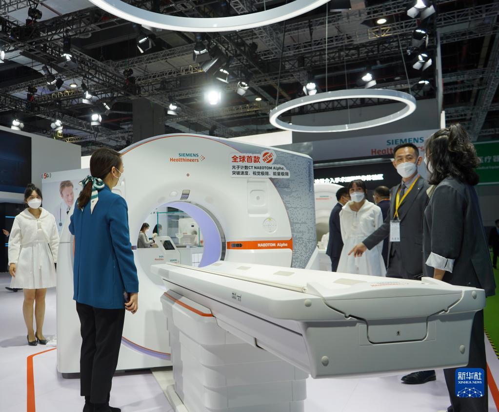 11月5日,在第五屆進(jìn)博會(huì )醫療器械及醫藥保健展區,觀(guān)眾在西門(mén)子展臺參觀(guān)展出的光子計數CT掃描儀。