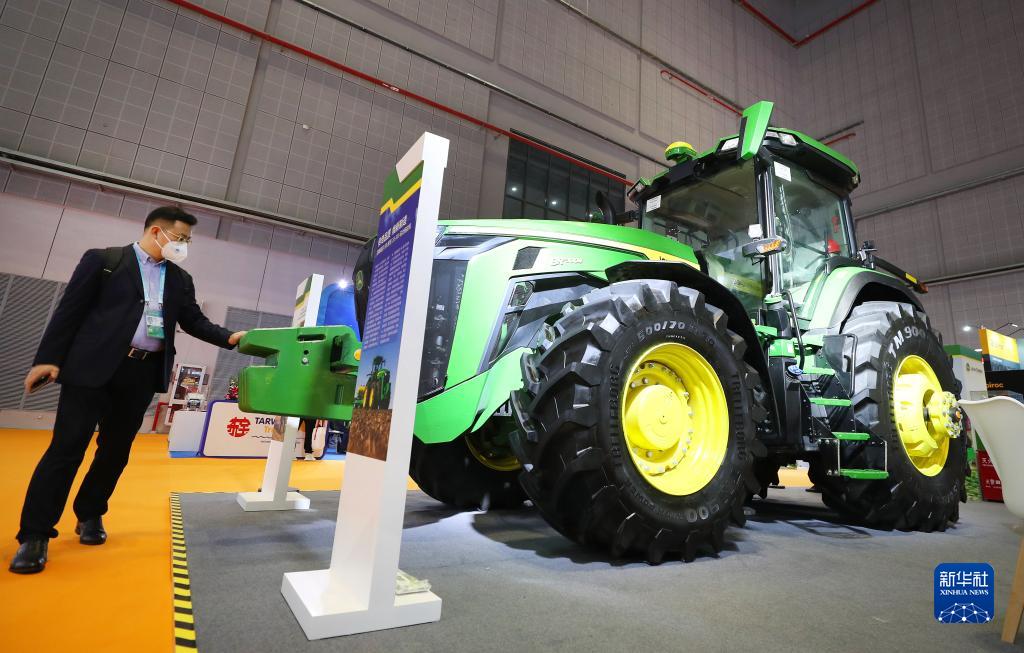 11月5日,參觀(guān)者在第五屆進(jìn)博會(huì )技術(shù)裝備展區內一輛大型拖拉機展品前駐足觀(guān)看。