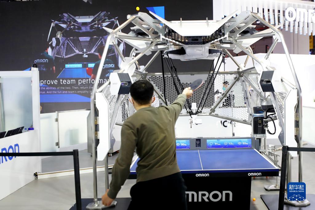11月5日,參觀(guān)者在第五屆進(jìn)博會(huì )技術(shù)裝備展區與“乒乓球機器人”互動(dòng)。