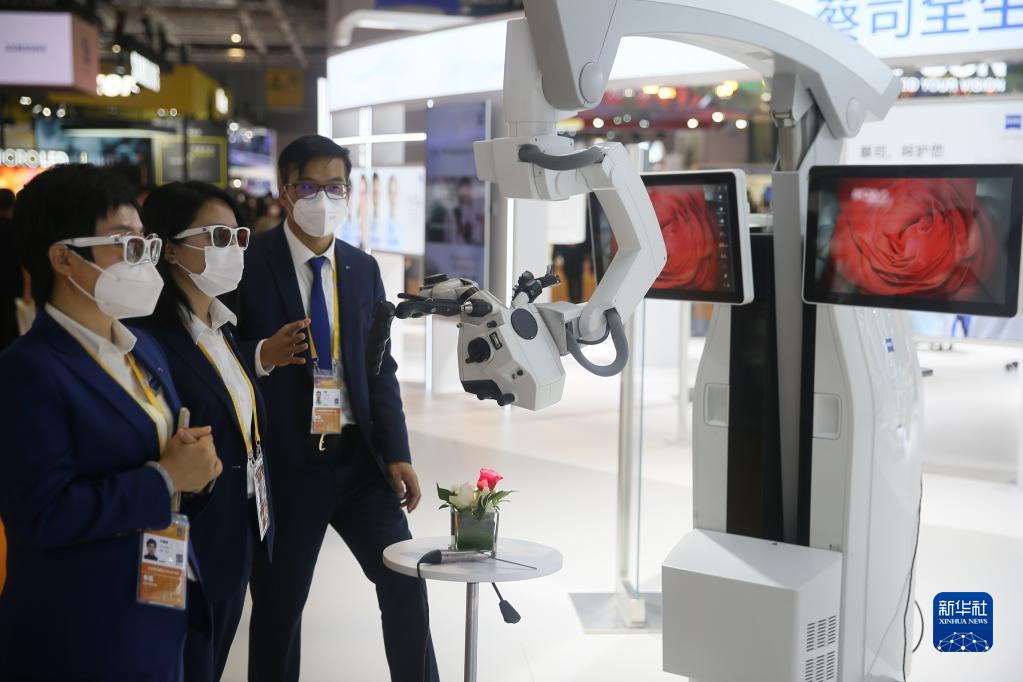 11月5日,參觀(guān)者在第五屆進(jìn)博會(huì )技術(shù)裝備展區蔡司展臺體驗顯微鏡。