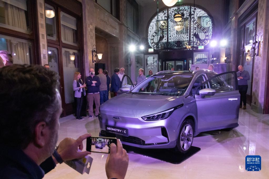 11月4日,在匈牙利布達佩斯,一位參觀(guān)者拍攝展出的吉利幾何C型電動(dòng)汽車(chē)。
