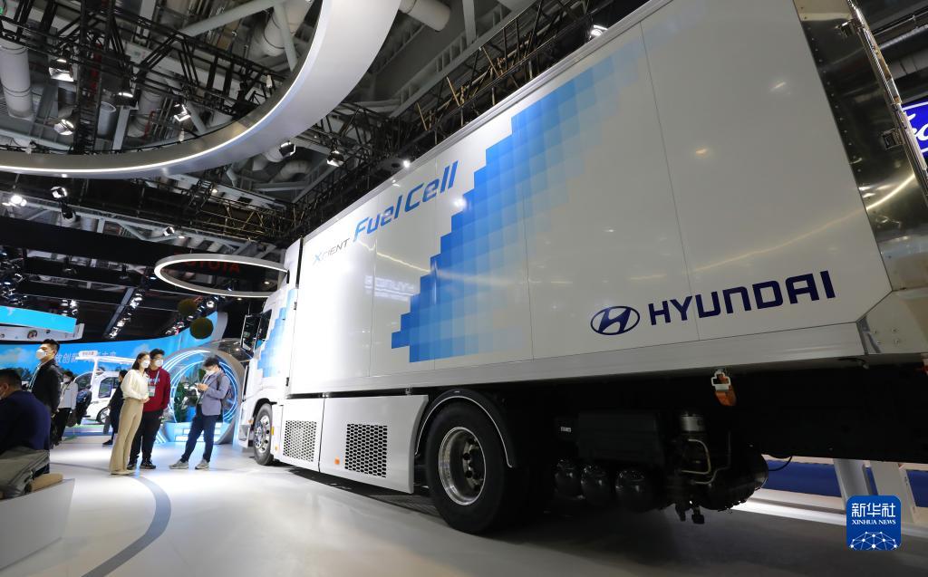 11月6日,參觀(guān)者在第五屆進(jìn)博會(huì )汽車(chē)展區韓國現代汽車(chē)公司展臺的氫燃料電池重卡旁交流。