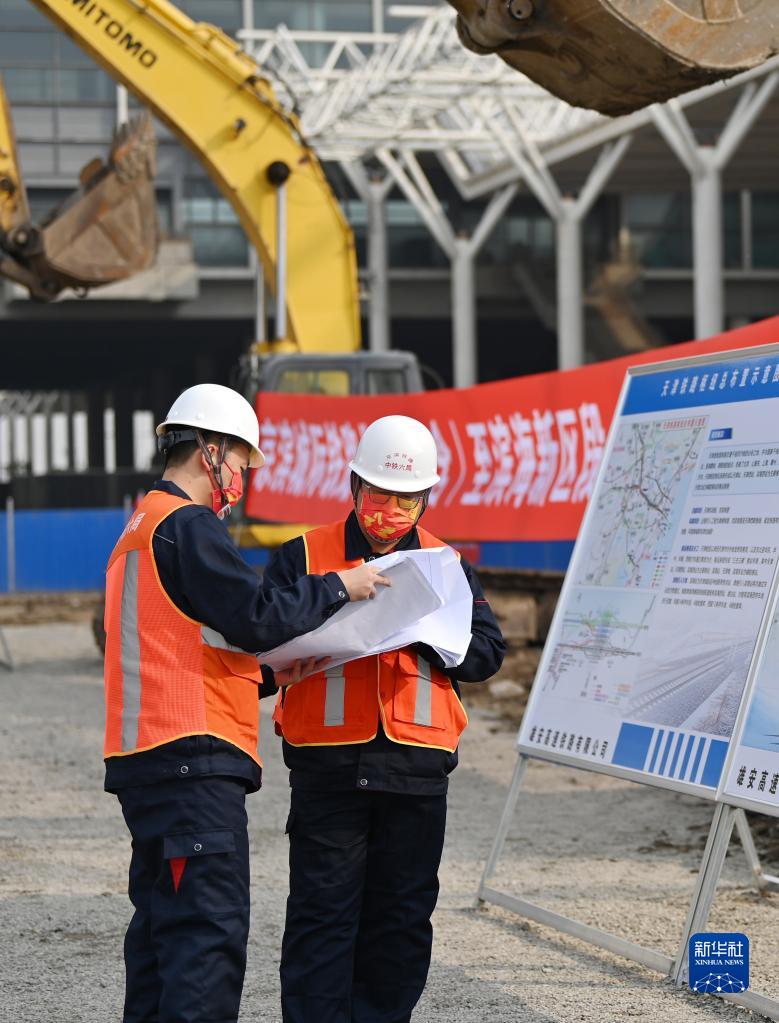 11月6日,工作人員在天津市濱海新區濱海西站施工現場(chǎng)核對圖紙。
