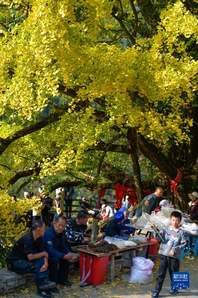 11月6日,村民在貴州省貴陽(yáng)市烏當區羊昌鎮黃連村的古銀杏樹(shù)下出售農產(chǎn)品。