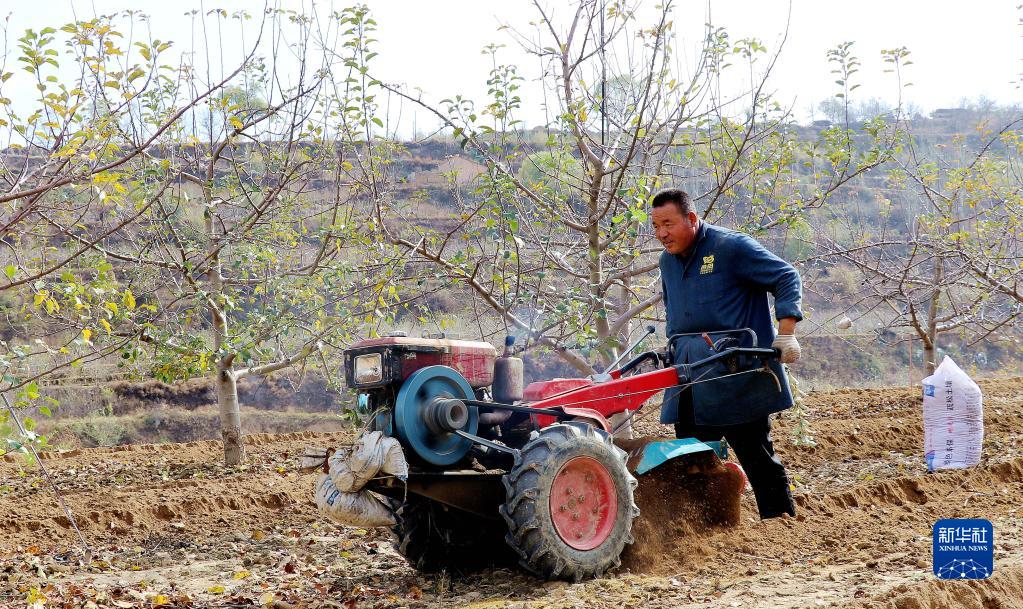 11月7日,在甘肅省平?jīng)鍪徐o寧縣威戎鎮楊灣村,果農在果園里駕駛農機開(kāi)溝施肥。