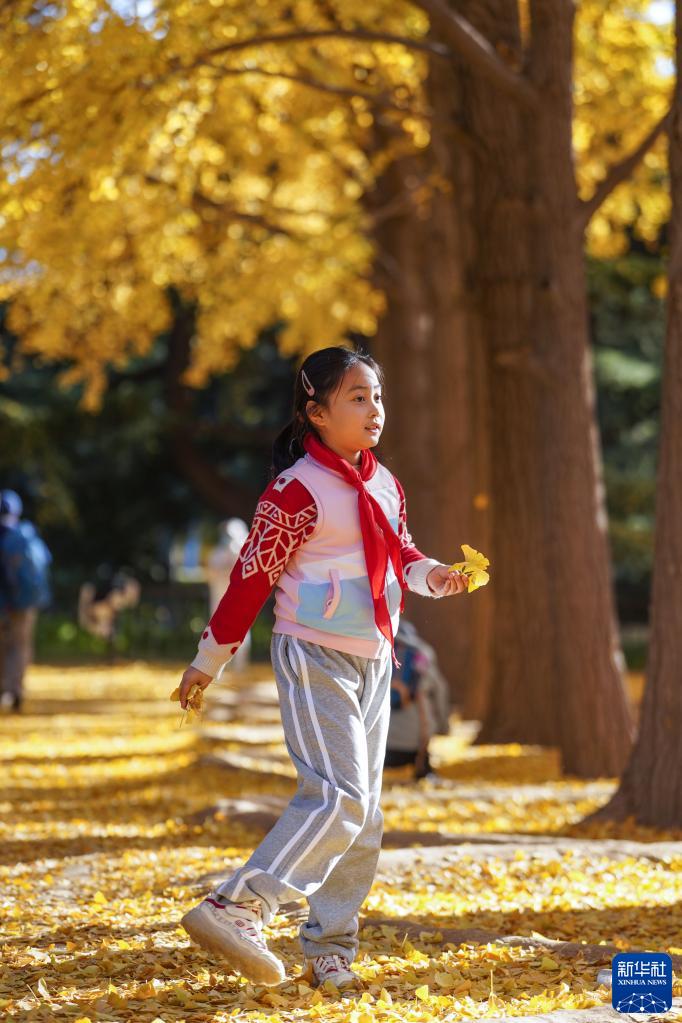 11月7日,一個(gè)小女孩在北京釣魚(yú)臺國賓館旁的銀杏大道上玩耍。