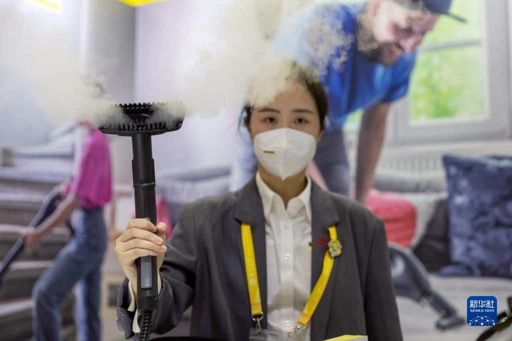 11月7日,在第五屆進(jìn)博會(huì )消費品展區德國卡赫展臺,工作人員演示多功能蒸汽機。該多功能蒸汽機在清潔時(shí)只需要水,無(wú)需化學(xué)清洗劑。