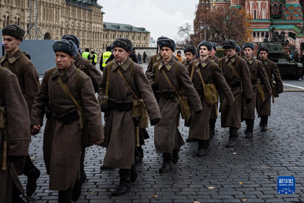 11月7日,在俄羅斯首都莫斯科,參加紀念活動(dòng)的演員走過(guò)紅場(chǎng)。