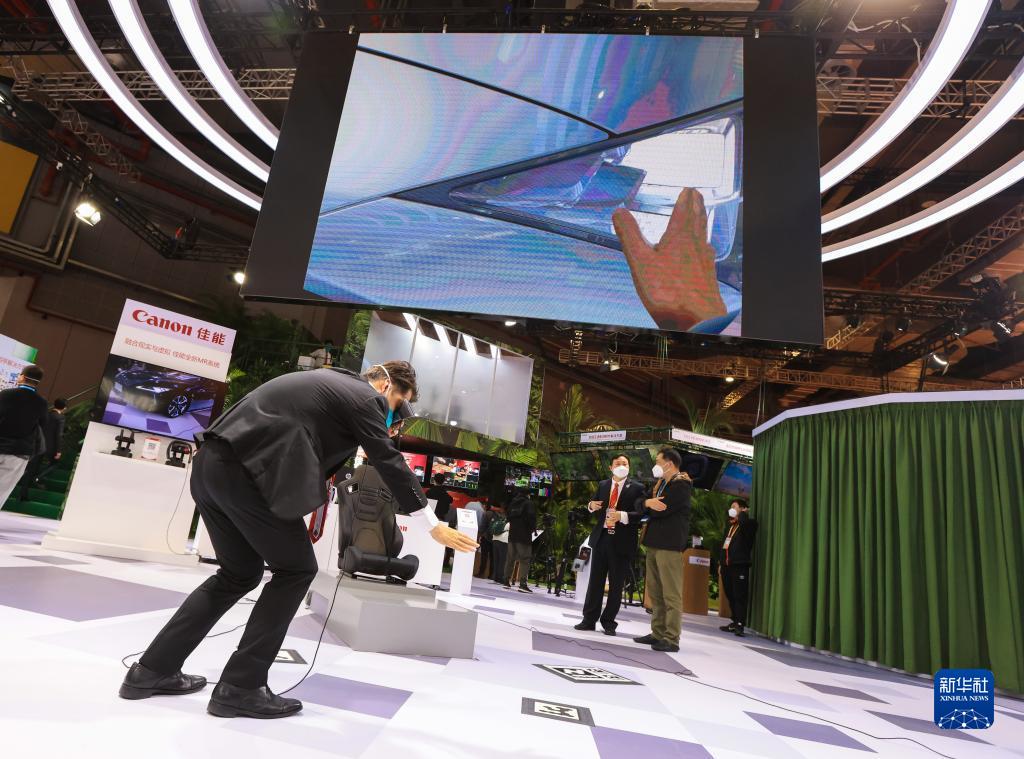 11月7日,展商在第五屆進(jìn)博會(huì )佳能展臺演示MR虛擬現實(shí)系統。