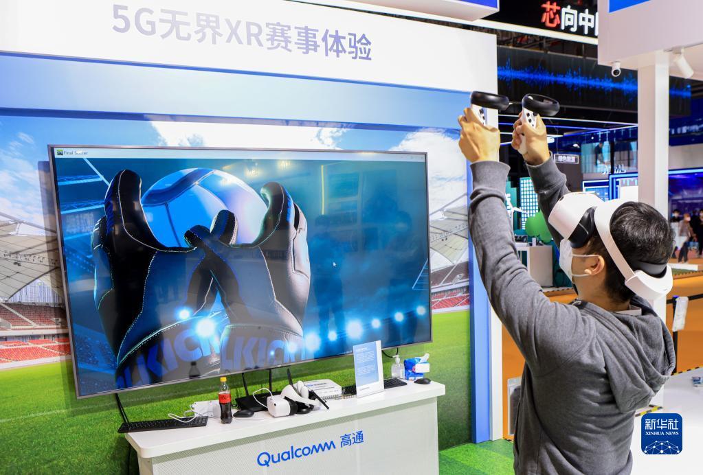 11月7日,參觀(guān)者在第五屆進(jìn)博會(huì )美國高通公司展臺參與5G無(wú)界XR賽事體驗。