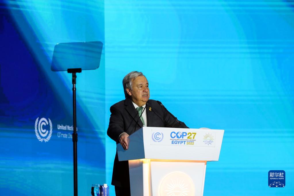 11月7日,在埃及沙姆沙伊赫,聯(lián)合國秘書(shū)長(cháng)古特雷斯在聯(lián)合國氣候變化大會(huì )氣候落實(shí)峰會(huì )開(kāi)幕式上講話(huà)。