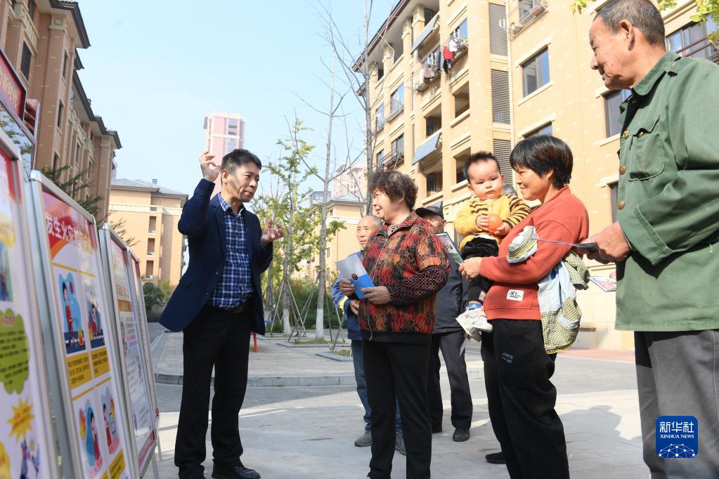 11月8日,在湖州市吳興區環(huán)渚街道一個(gè)居民區,當地成人文化技術(shù)學(xué)校的老師結合宣傳展板向居民介紹消防安全知識。