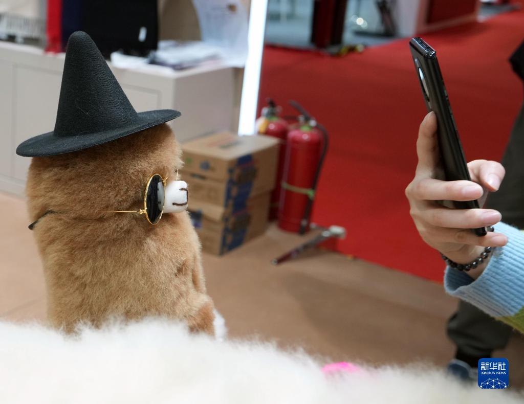 11月8日,在第五屆進(jìn)博會(huì )上,參觀(guān)者拍攝“溫暖駝”展臺的羊駝玩偶。