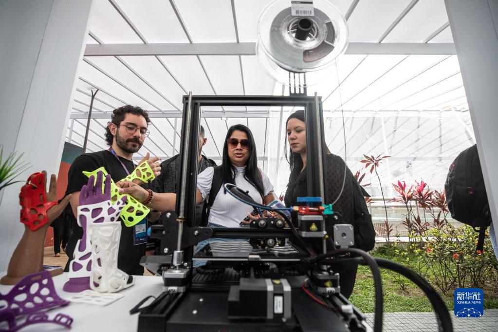 11月8日,在巴西里約熱內盧,參觀(guān)者在“里約創(chuàng )新周”上體驗3D醫療模型打印設備。