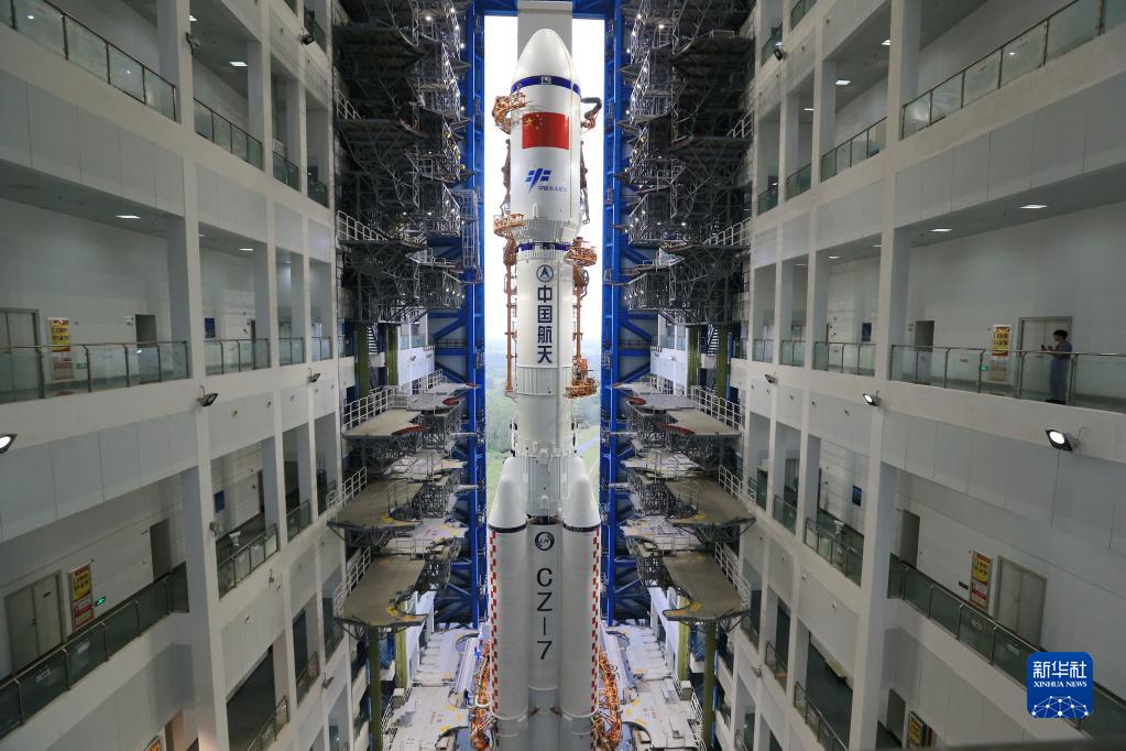 11月9日,天舟五號貨運飛船與長(cháng)征七號遙六運載火箭組合體在進(jìn)行垂直轉運前準備。