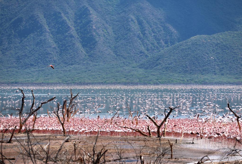 博戈里亞湖位于肯尼亞?wèn)|非大裂谷地區中部,距首都內羅畢約300公里,是一個(gè)內陸咸水湖泊。博戈里亞湖沿岸被樹(shù)林和草地覆蓋,擁有地下熱泉,湖內豐富的藻類(lèi)等生物吸引了上百萬(wàn)只火烈鳥(niǎo)在此棲息,被稱(chēng)為火烈鳥(niǎo)天堂。環(huán)繞博戈里亞湖建立的國家保護區面積達107平方公里,是數百種鳥(niǎo)類(lèi)的棲息地,2001年被國際濕地公約組織列入國際重要濕地名錄。