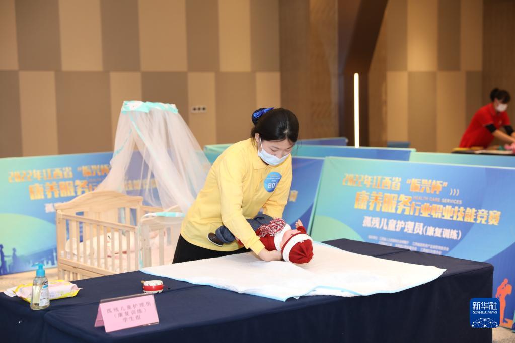 11月9日,參賽選手在參加孤殘兒童護理員(康復訓練)組別的比賽。