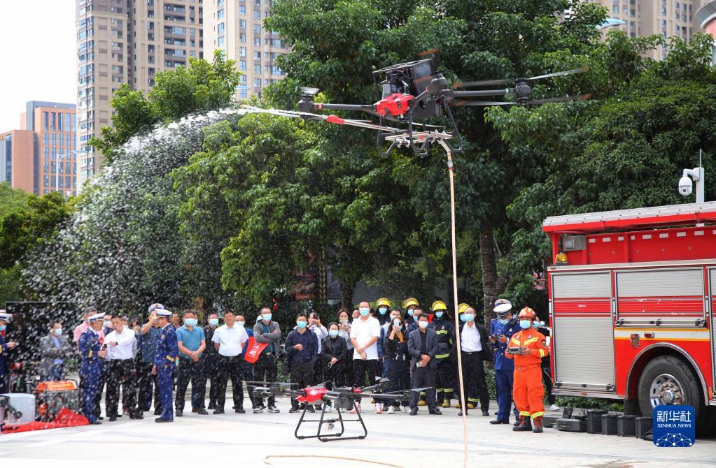 11月9日,在福建省龍巖市新羅區,消防員在演示無(wú)人機滅火操作。