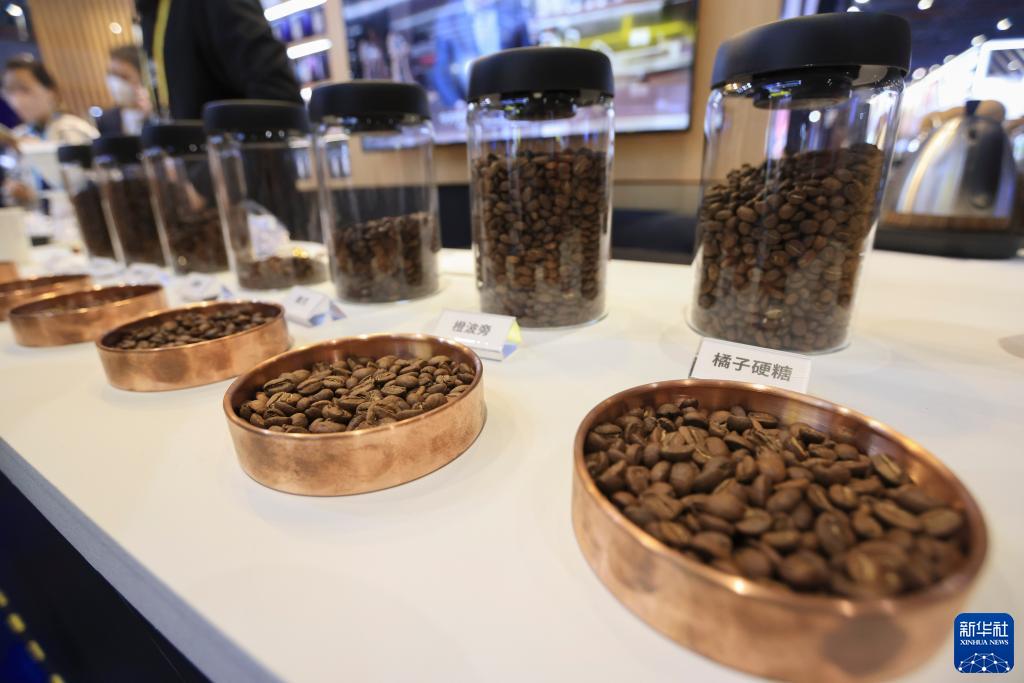 11月9日在第五屆進(jìn)博會(huì )食品及農產(chǎn)品展區麥隆咖啡展臺拍攝的咖啡豆。