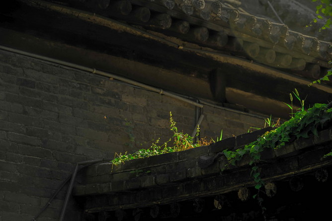 ??? 墻頭瓦檐,新生的嫩綠在百年的時(shí)光里舒展,陽(yáng)光穿過(guò)錯落的屋檐,像一束追光,讓新生命變成主角。