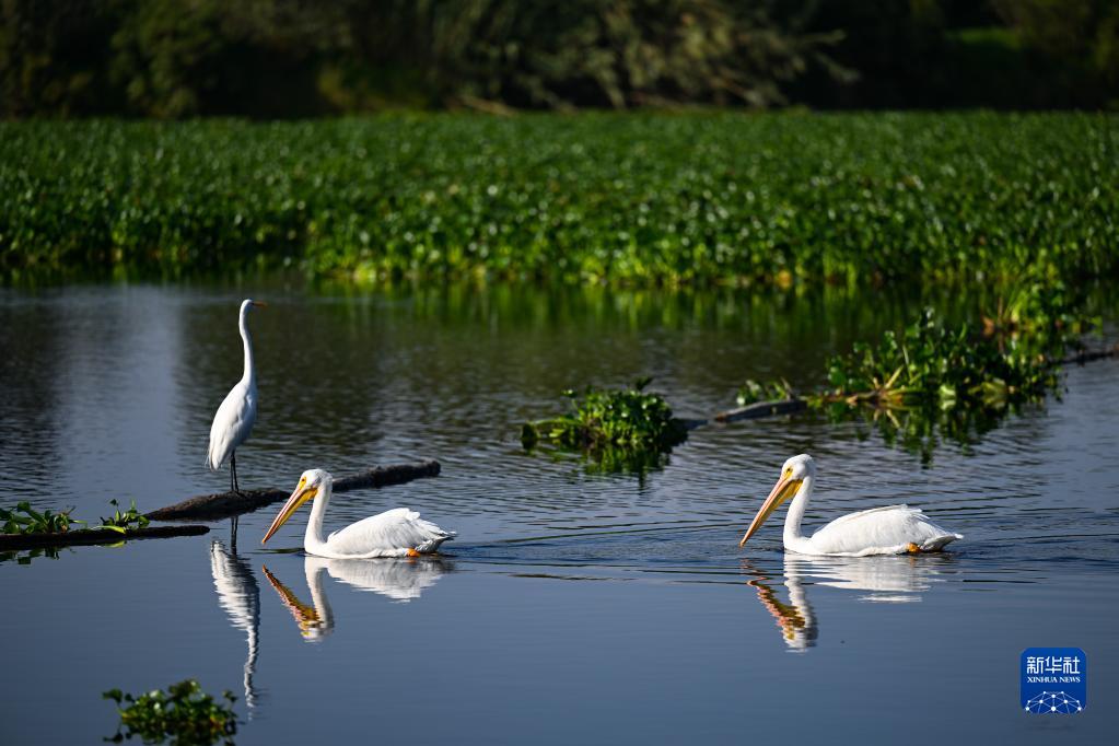 這是在墨西哥首都墨西哥城霍奇米爾科生態(tài)公園拍攝的鵜鶘和白鷺(2022年11月2日攝)。