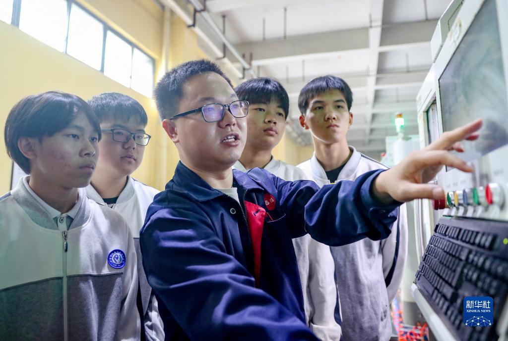 11月9日,華鎣市一家電子產(chǎn)品企業(yè)技師在給職業(yè)教育培訓中心的學(xué)生講解生產(chǎn)設備操作技術(shù)。