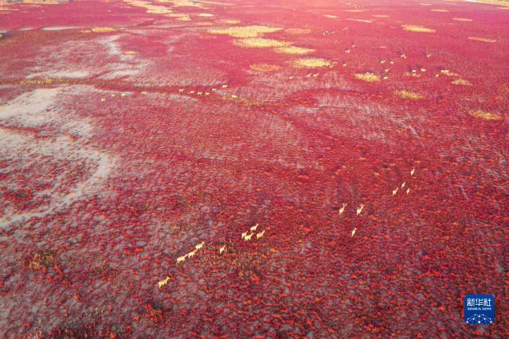 在鹽城東臺條子泥濕地拍攝的麋鹿(11月9日攝,無(wú)人機照片)。