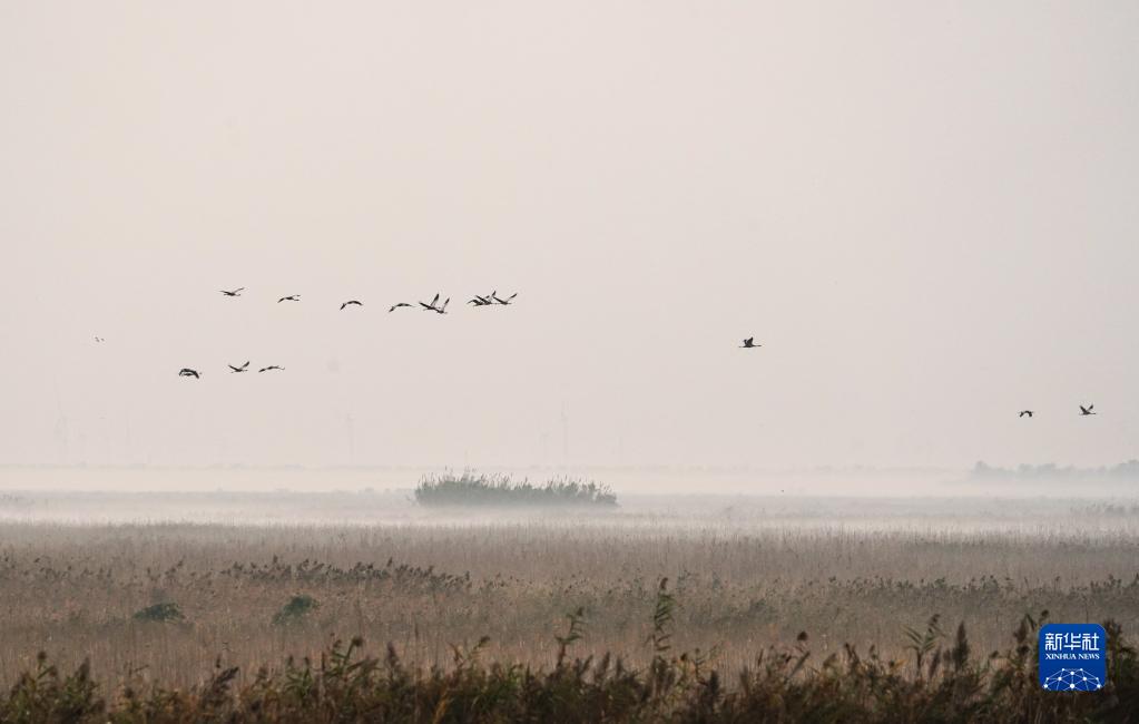 成群的禽鳥(niǎo)飛翔在鹽城濕地珍禽國家級自然保護區(11月8日攝)。