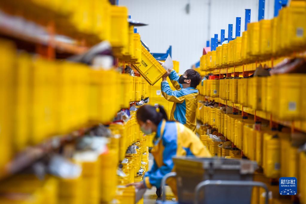 11月10日,在位于江蘇省南京市江寧區的蘇寧華東物流中心,工人在揀選商品。
