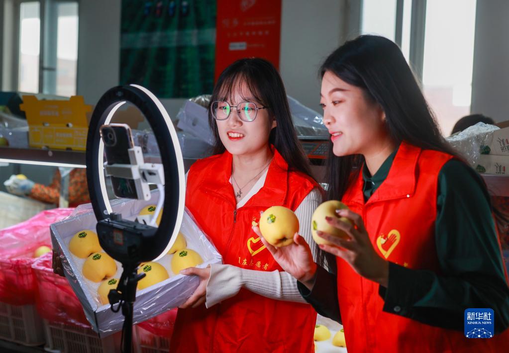 11月10日,在山東省榮成市夏莊鎮一處現代果園的倉儲中心,黨員志愿者通過(guò)直播帶貨幫助果農銷(xiāo)售蘋(píng)果。