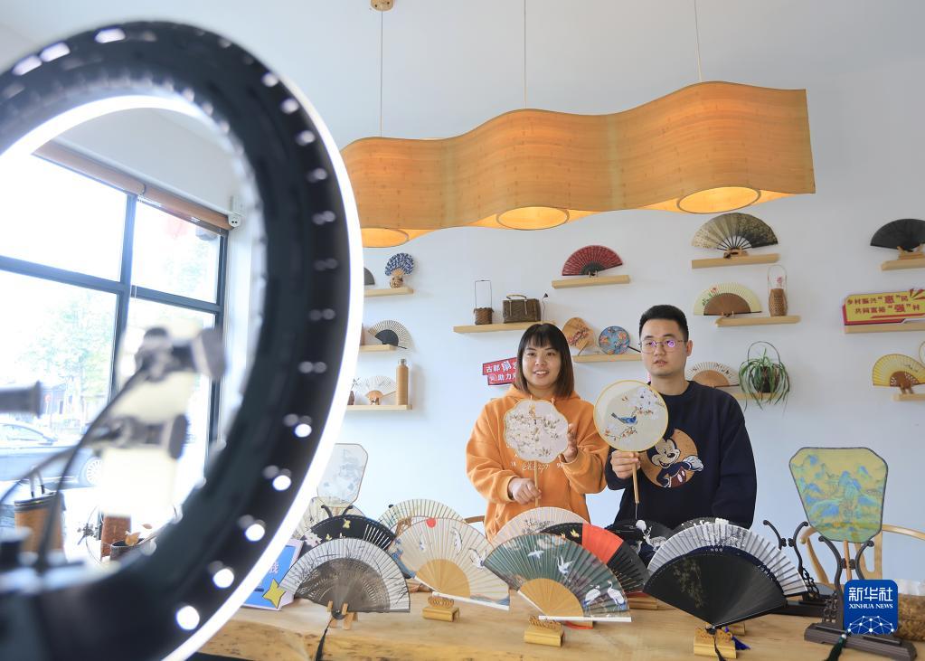 11月9日,在浙江省湖州市安吉縣鄣吳鎮的“扇藝共富”工坊,創(chuàng )業(yè)者通過(guò)電商平臺直播帶貨方式推介鄣吳竹扇。