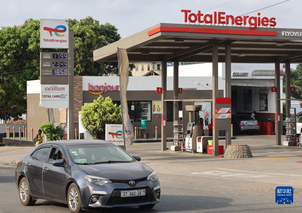 11月10日,汽車(chē)駛過(guò)加納首都阿克拉一家加油站。
