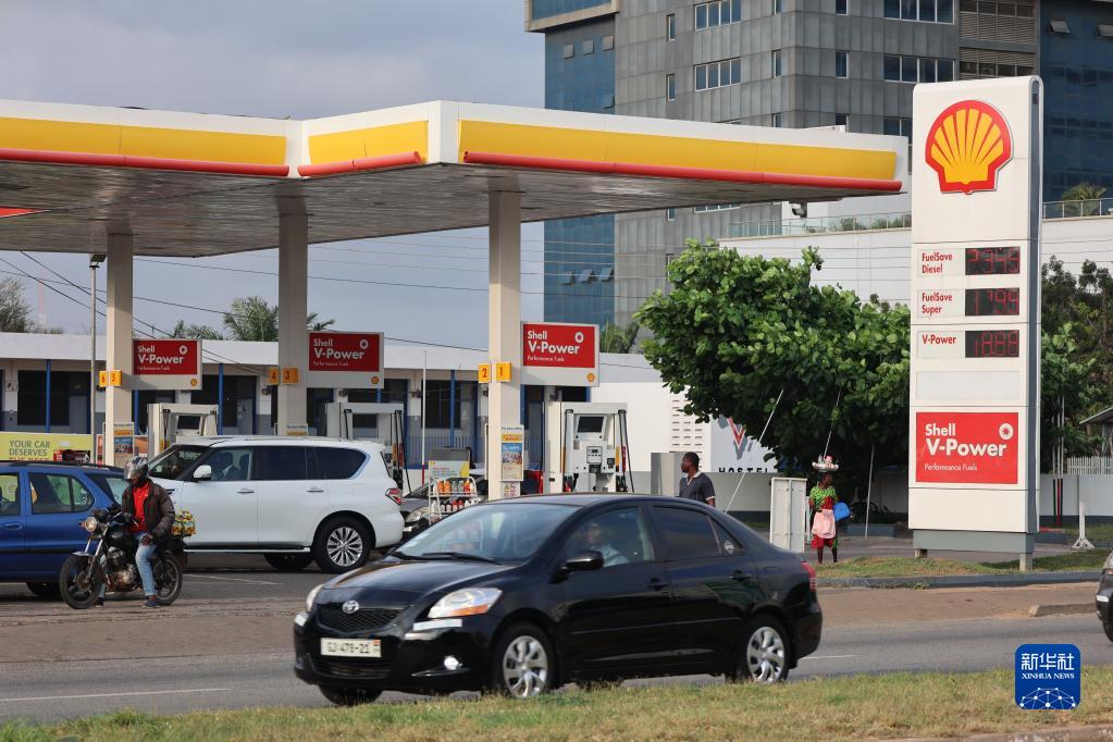 11月10日,汽車(chē)駛過(guò)加納首都阿克拉一家加油站。